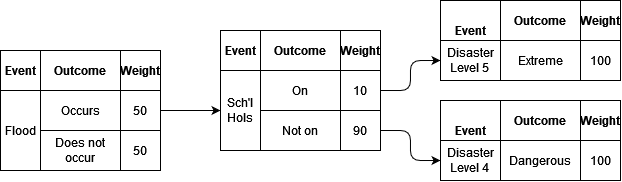 - In order of Events without outcome dependencies to those that do, generate an SxT array of uniformly distributed random numbers between 0 and 1.