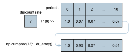 - Calculate the discount rates for each period (t) as a 1xT array.